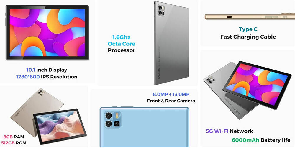 جهاز Oteeto Tab 12 Pro، شاشة IPS مقاس 10.1 بوصة، معالج ثماني النواة بسرعة 1.6 جيجاهرتز، ذاكرة وصول عشوائي سعتها 8 جيجابايت، ذاكرة تخزين داخلية سعتها 512 جيجابايت، نظام تشغيل Android 13، كاميرا أمامية